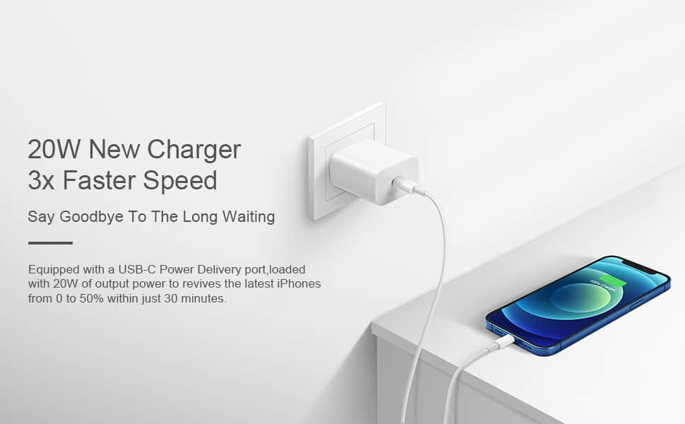• PD 3.0 Fast Charger for iPhone: iPhone Fast Charger equipped with 20W PD 3.0 USB Type C power delivery wall plug, PD 3.0 Quick-Charge USB C port provides Max 20W output power, charge your device up to 3x faster than original 5W charger, charging your iPhone 13 up to 50% in just 30 minutes, saving over 1.5hrs for you.